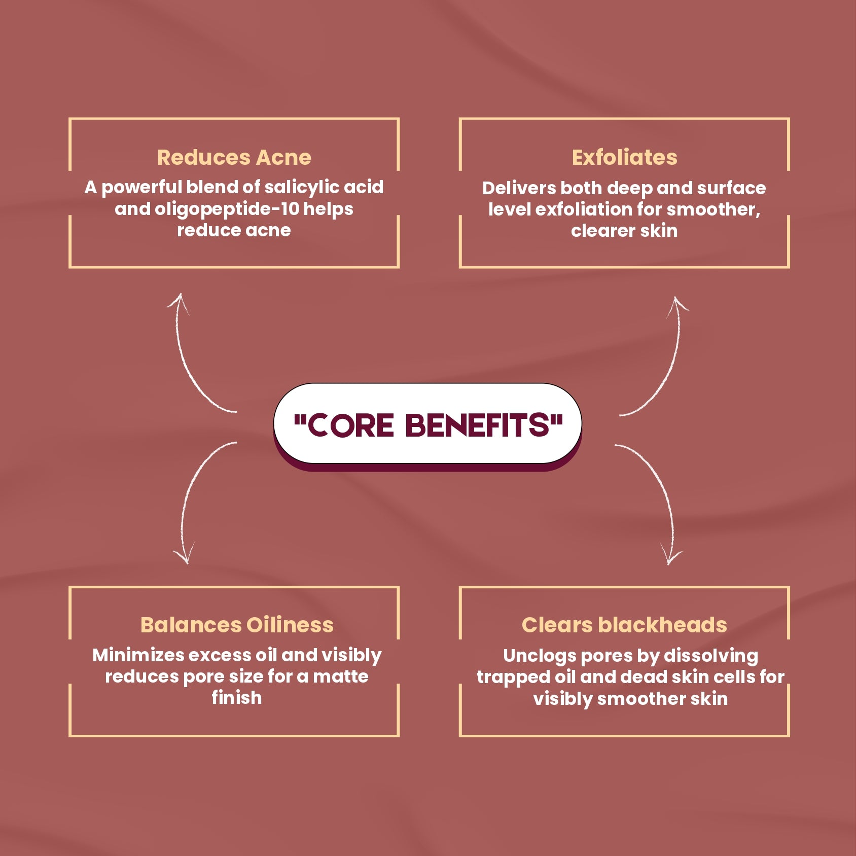 A targeted anti-acne serum with 2% Salicylic Acid that penetrates deep into pores to fight acne, unclog blackheads, and control excess oil. Lightweight and fast-absorbing, it gently exfoliates, refines skin texture, and helps fade post-acne blemishes without over-drying. Specially designed for oily and acne-prone skin, this serum is non-comedogenic, alcohol-free, and gentle enough for daily use.